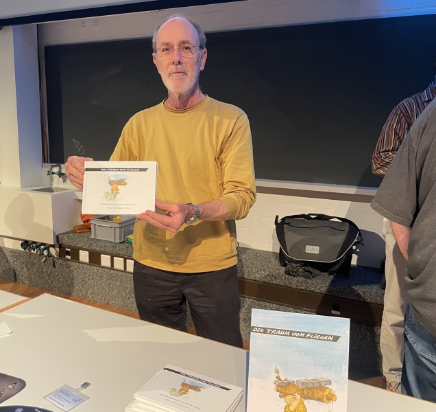 Karikaturist Andreas Locher nutzte die Gelegenheit, seine Sammlung an Modellflug-Karikaturen vorzustellen. Dieses Buch wird in Kürze über die Redaktion der Zeitschrift Modellflugsport bestellbar sein.