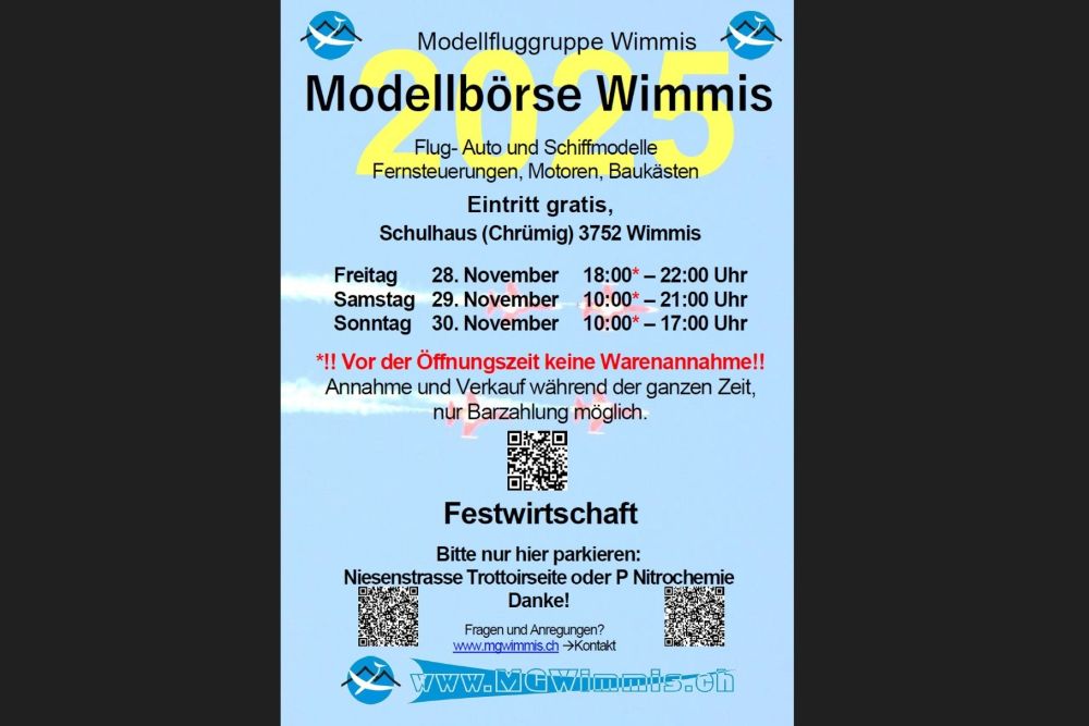 Auch 2025 findet die bekannte Börse der Modellfluggruppe Wimmis statt. Wenn Du nichts zum Kaufen findest, triffst Du bestimmt den einen oder anderen Kollegen zum Fachsimpeln und geniesst schöne Momente in unserem Beizli. Wenn Du etwas verkaufen willst, bringe es vorbei, sage uns was es kosten soll. Den Rest übernehmen wir. Wird es verkauft kannst Du das Geld abholen kommen (abzüglich unserer Provision), wenn es nicht verkauft wurde enstehen Dir keine Kosten.